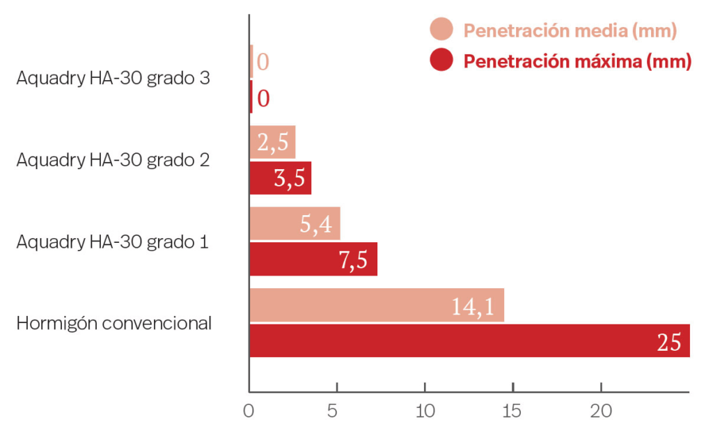Pero si por el contrario su proyecto tiene un alto riesgo de entrada de agua, donde la estructura está por debajo del freático o sumergida o con presión hidrostática, Aquadry Concrete® dispone de diseños exclusivos que pueden llegar hasta a la impermeabilidad total, ofreciendo valores de 0,00 mm de penetración máxima y media, según ensayos mediante UNE-EN 12390-8:20, lo que lo hace sustitutivo de los sistemas de impermeabilización mediante membranas.