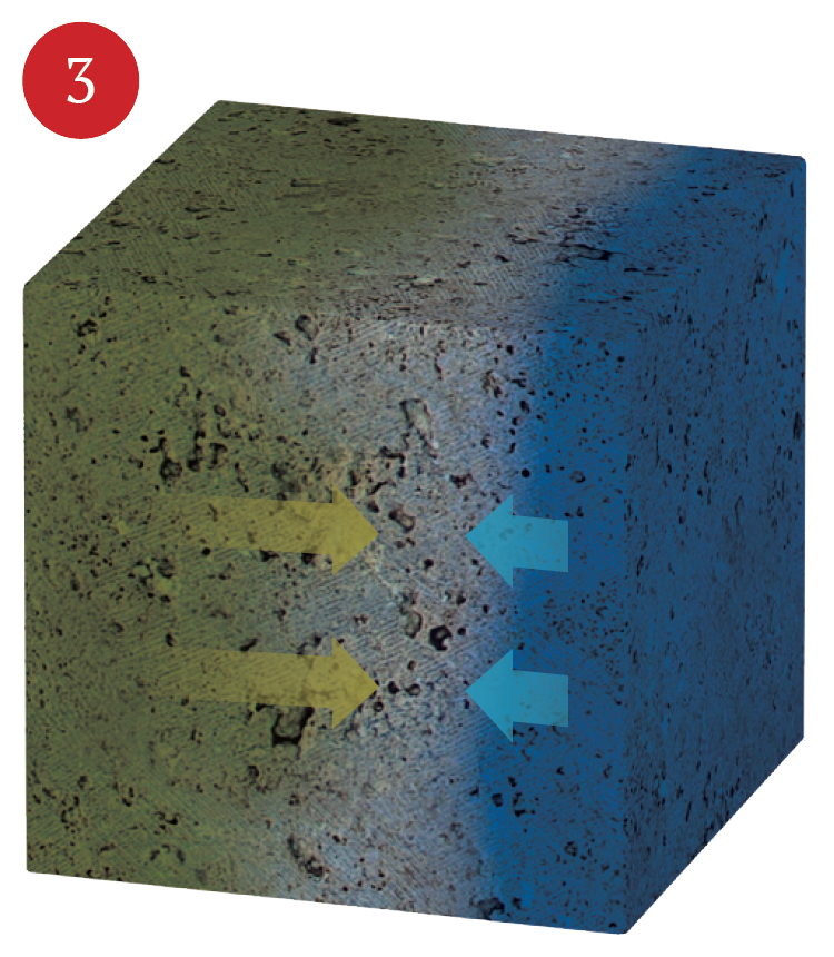 Sus compuestos activos se reactivan en cuanto detectan agua o humedad. Utilizan esa misma agua como medio de migración para avanzar por difusión química hacia la zona húmeda. Una vez allí, reaccionan con los compuestos del cemento, generando geles C-S-H secundarios y precipitados cristalinos que sellan poros, microfisuras y capilares desde el interior.